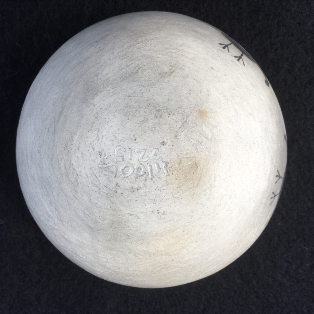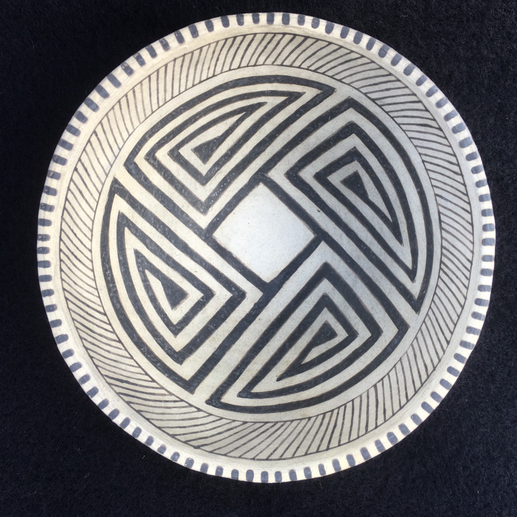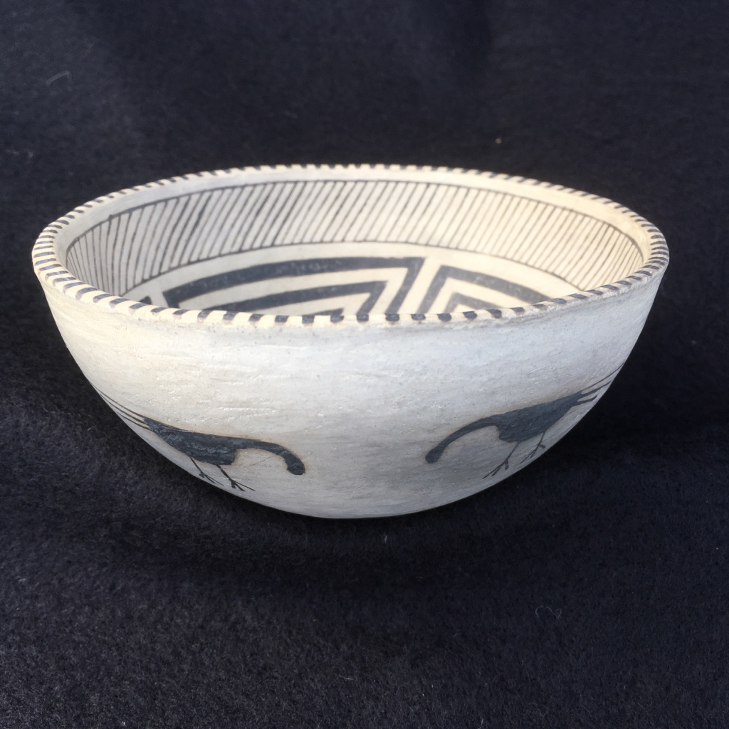 High fired quality small bowl with detailed design inside and two turkeys painted on exterior. Warm white slip with black paint. It rings like a bell!